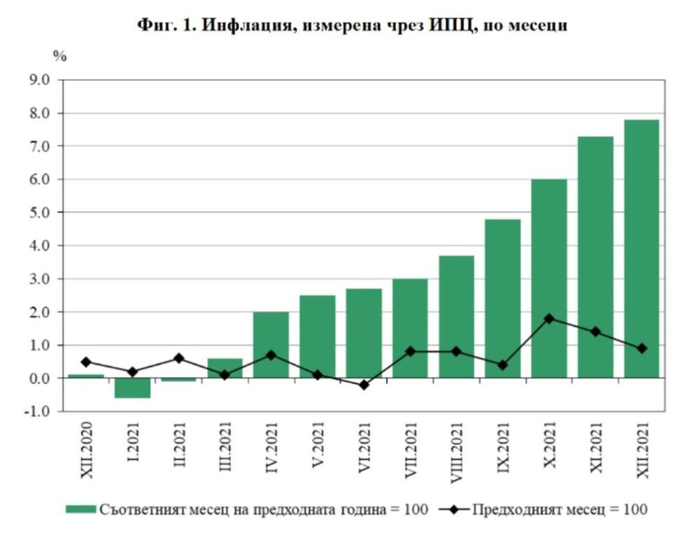 НСИ отчете годишна инфлация от 7.8% за декември 2021 г. спрямо декември 2020 г. Това в най-голямото повишение на индекса на потребителските цени в страната от декември 2008 г. насам.